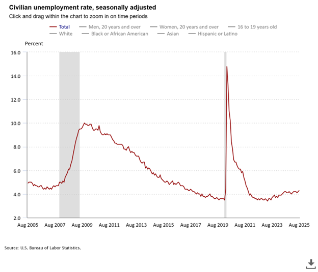 U.S. Bureau of Labor Statistics. (2025, August). Civilian unemployment rate. U.S. Bureau of Labor Statistics; U.S. Bureau of Labor - Office of Employment and Unemployment Statistics. https://www.bls.gov/charts/employment-situation/civilian-unemployment-rate.htm