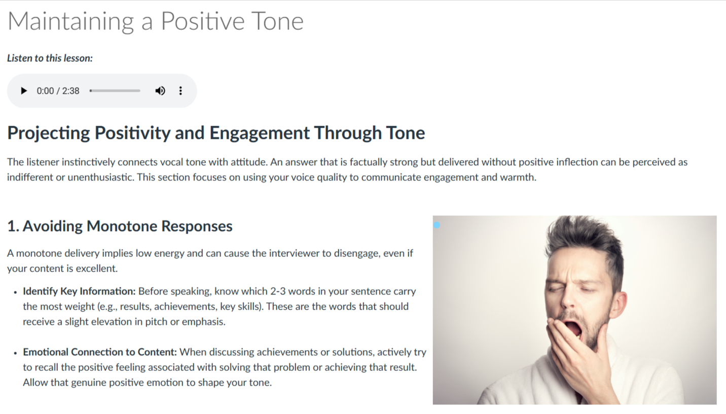 The following screenshot shows a portion of the lesson “Maintaining a Positive Tone.” The lesson includes an audio version made with AI text-to-speech technology, and a video lesson (included on the following page).