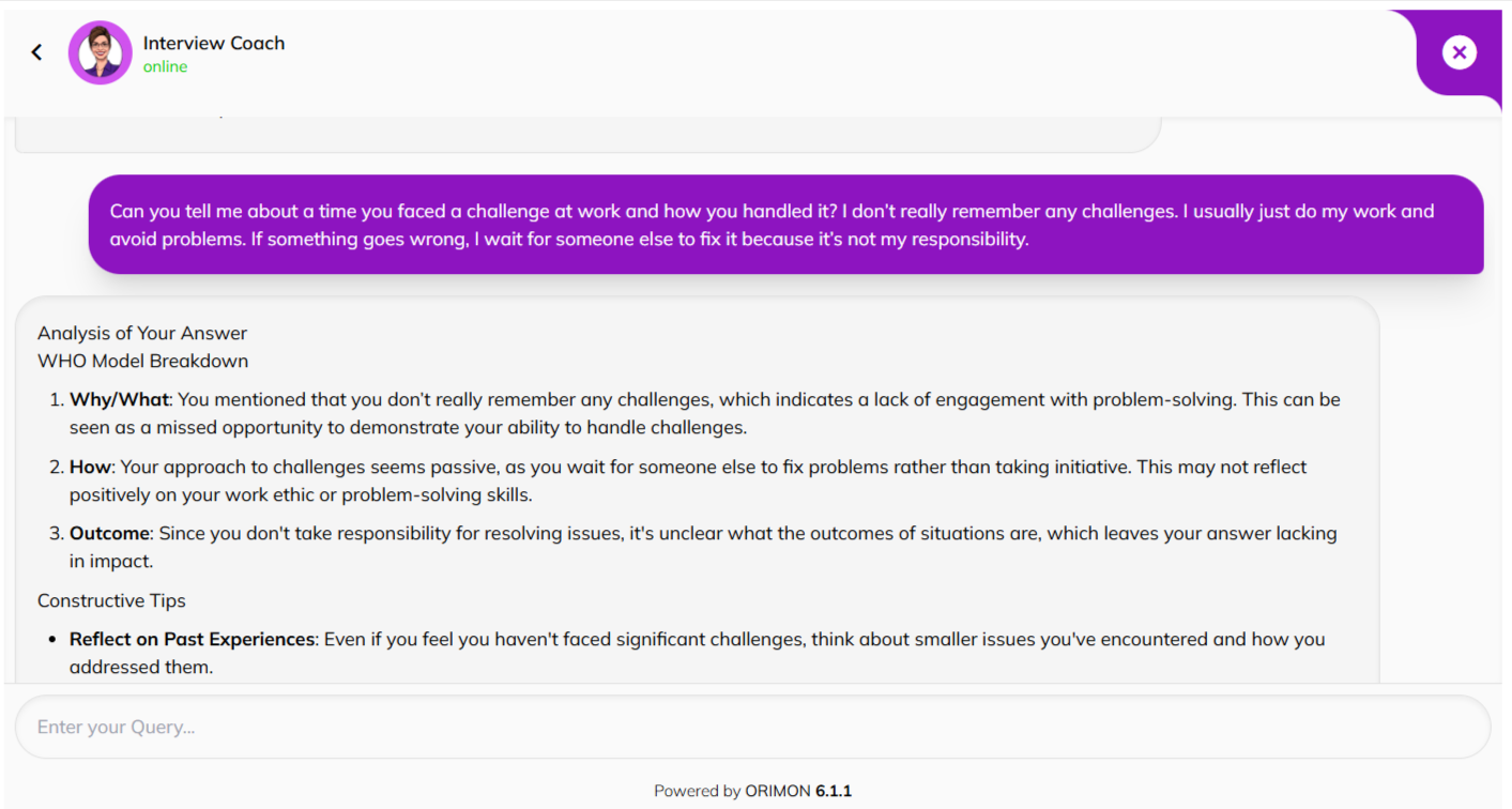 The following screenshot shows an example interaction with a custom-trained AI chatbot that is designed to at as an interview coach. Students can enter in an interview question and answer, which is then analyzed by the AI using the WHO framework developed by the course instructor.